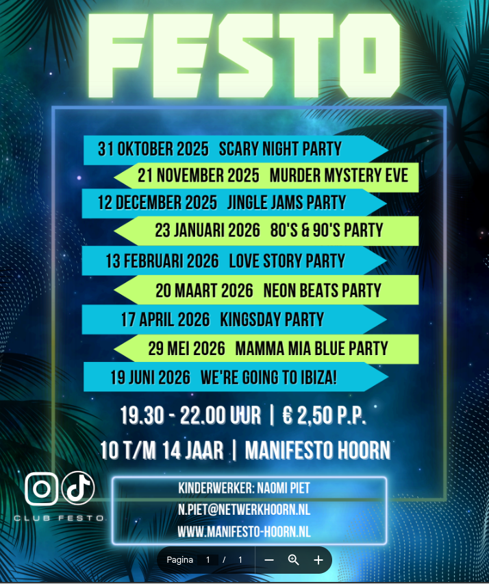 Ook dit jaar organiseert het Kinderwerk weer de Kinderdisco en Club Festo (tienerdisco). Een gezellige en veilige manier voor kinderen en tieners om samen te dansen, muziek te luisteren en nieuwe vrienden te maken. Hieronder kunt u alle data vinden.