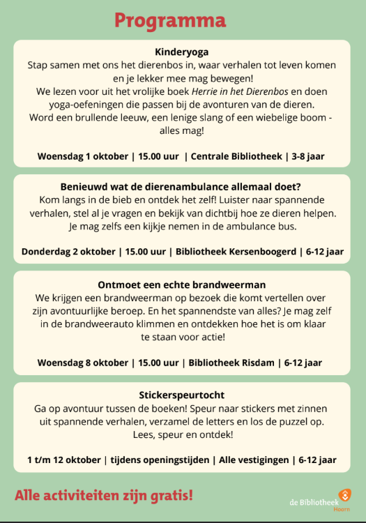De Bibliotheek Hoorn organiseert jaarlijks activiteiten rondom de Kinderboekenweek. Het programma hiervan sturen wij als bijlage mee.
